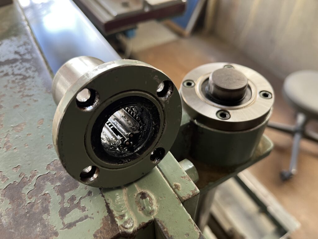 スライドブッシュという部品が壊れてました。ベアリングのボールがコロコロ落ちていくんですが…。さっそくモノタロウでおんなじ規格であろう部品を購入。グリスをさして取り付けます。シャフトが曲がってるのかセンターがずれてますが無理やり叩き込みます。左右に2か所あるので壊れてない方も交換しときます。こちらはセンターばっちりでスコンと入りました。シャフトも交換した方が良かったかも。完全ではないにしろどうにか動くようになったのでこのまま使ってみよう…。